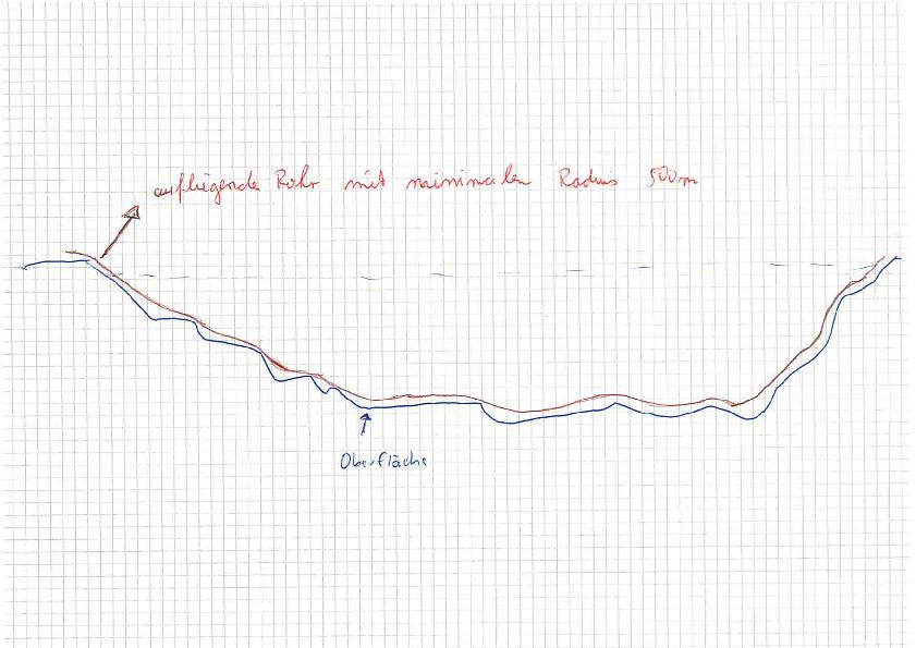 Hallo ZusammenIch habe folgendes Problem.:Ich habe eine Oberfläche (DGM eines Seebodens) auf den eine Pipeline (liegt als Achsgeometrie vor) abgesenkt werden soll.Meine Aufgabe ist zu schauen, wie die Pipeline auf dem Seeboden zu liegen kommen könnte um den Freiraum an kritischen Stellen zu bestimmen.Es läuft also darauf hinaus, dass ich eine ausgerundete Gradiente konstruieren muss, die sich möglichst nah an die Oberfläche anschmiegt, aber einen bestimmten Radius (hier 500m) nicht unterschreitet (siehe Bi ...
