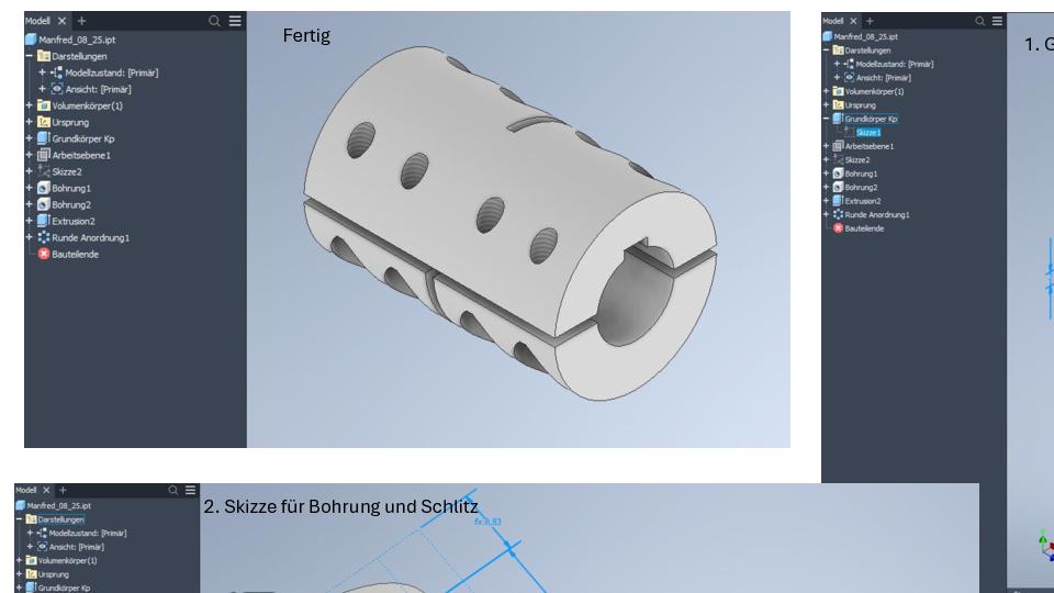 Mein Versuch zum NachbauHallo zusammen,ich habe versucht, das Modell nachzubauen, und möchte hier kurz meine Vorgehensweise sowie die Punkte schildern, die mir dabei aufgefallen sind:Nachteile bzw. Unterschiede zu Manfred Gündchen Skizze:1. Ich sehe auf den ersten Blick nicht, wie tief die Senkung der Schraubenköpfe ins Material reicht. In der von Manfred Gündchen Skizze ist das hingegen sehr schön ersichtlich.2. Das Werkzeug Bohrung habe ich zweimal verwendet, wodurch in Zeichnungen (idw) leider nicht kor ...