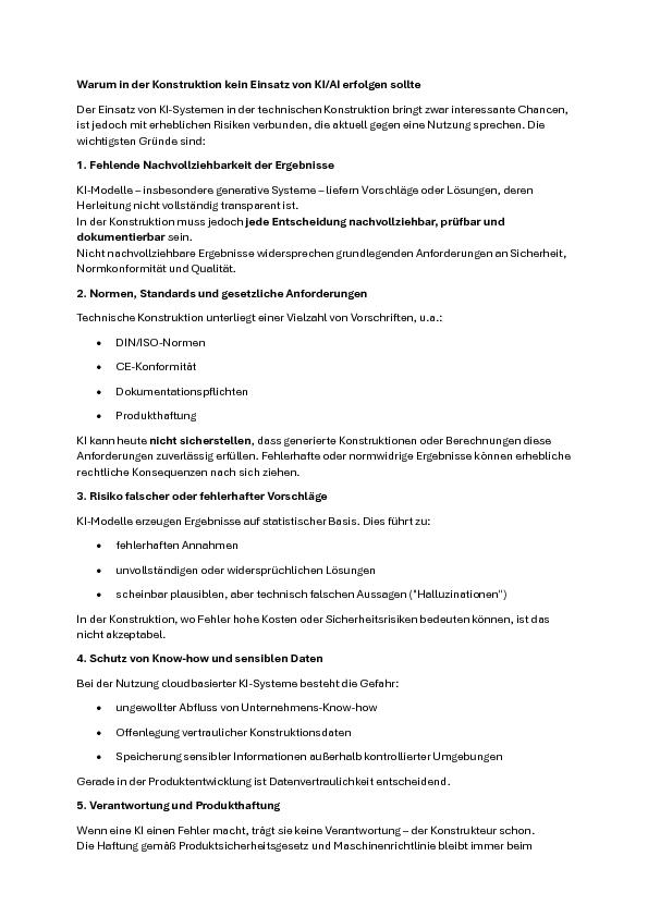 Hallo Wolfgang,ich sehe das auch Fraglich mit dem Datenschutz und mit unkontrollierbaren Daten Abfluss. Habe mal die KI gefragt warum in der Konstruktion kein Einsatz von KI/AI erfolgen sollte. Die KI rät davon ab.------------------GrußVolker