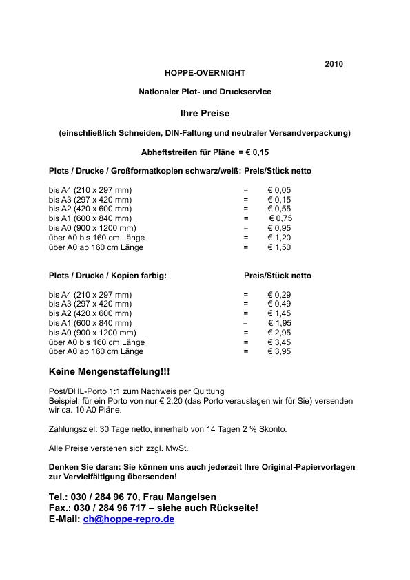 Hallo,wir kaufen das Papier hier.Tinte für unseren HP Designjet T930 kaufen wir online und die Originalen.Im Plotter wird dann ausgegeben wie viel Papier und Tinte pro Plot benötigt wurde.Bei normalen Plänen sind das ca. 0,5ml Tinte pro m². Das wären bei 300ml Patronen für 180€ UVP also 0,3€ + Papier.Wenn wir plotten lassen nehmen wir Repro Hoppe aus Berlin. Anbei eine ältere Preisliste. ------------------Error in Layer 8