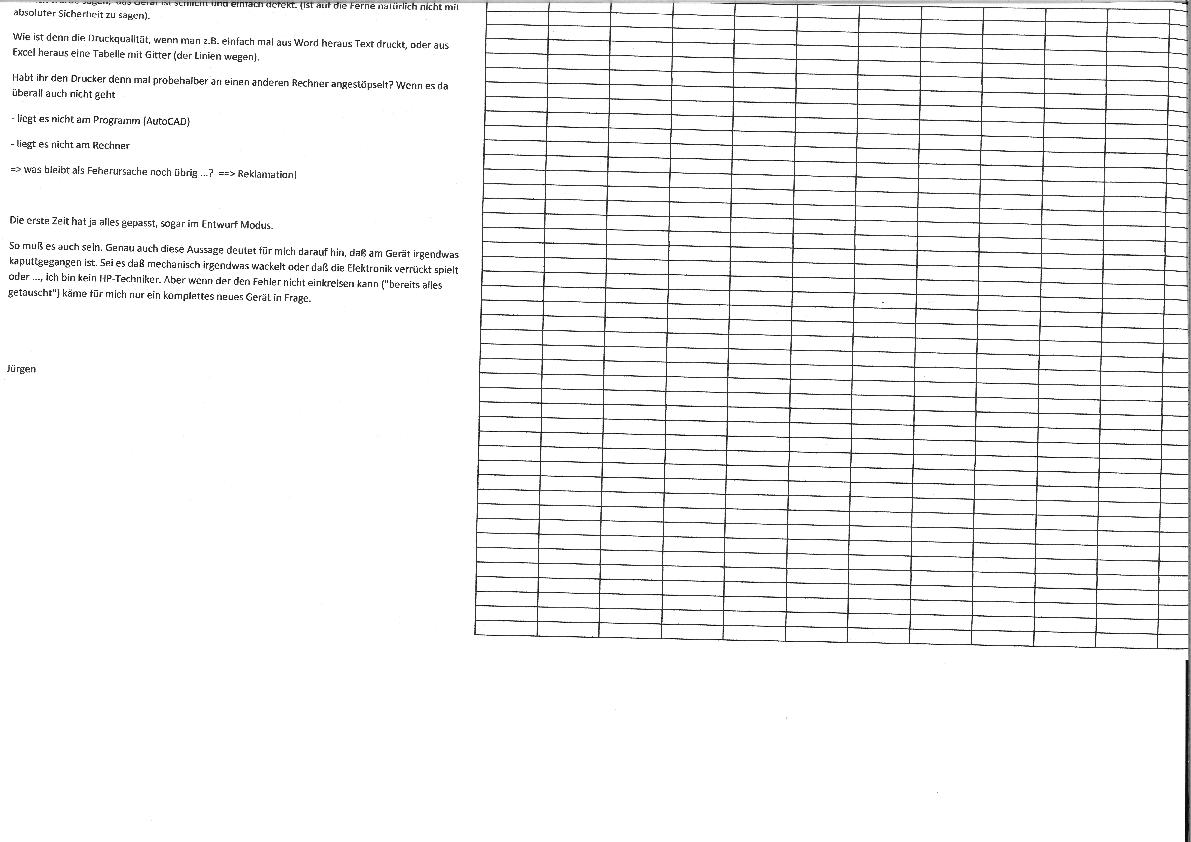 Wenn "er" schon mal Druckt, ist es ja gut ! Sicher nur eine Frage des Treibers und nicht der Schnittstelle. Welchen Treiber nutzt Du, wird einer vom OS zur Verfügung gestellt (ich kenne XP nicht), oder von Acad selbst ? Welche Acad Version hast Du ? ------------------ Lutz