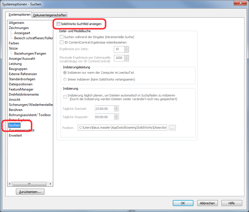 SolidWorks : Suchfenster ausblenden
