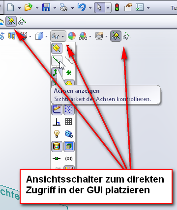 Hallo KB-BLUST,Zitat:Original erstellt von KB-BLUST:Ich wuerde gerne die Bezuege (Ebenen/Achsen/Ksys) ab und zu anzeigen, [...]Das geht recht elegant. Du kannst entweder im Ansichtsmenu steuern, was du angezeigt bekommen möchtest, in deinem Fall Ebenen, Achsen oder Koordinatensysteme. Schneller geht es über in der GUI platzierte Schalter, wenn du (und deine Anwender ?) das wirklich so oft brauchen. Du kannst dir die über Extras/Anpassen in Head-Up Menu (das ist im Grafikbereich am oberen Bildrand), in Tool ...