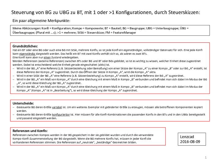 Hallo Kai,du kannst in einer Baugruppe eine Gleichung erstellen, die einen Wert an eine Komponente weitergibt. Diese Gleichung kannst du konfigurieren.oderdu kannst z.B. in einer Baugruppe eine steuernde Skizze erstellen. Die Bemaßung in der Steuerskizze kannst du konfigurieren. Die Komponente kann dann z.B. über eine Skizzenbeziehung auf die Steuerskizze zugreifen.Bedenke aber: Eine Komponente mit einer Konfiguration kann auch nur einen Zustand wiedergeben!Soll die Komponente gleichzeitig in mehreren Zust ...