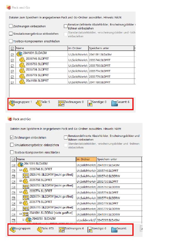 Hallo zusammen,vielleicht weis hier jemand Abhilfe.Wir speichern bei uns für Doku-Zwecke öfters Datein via "Pack and Go" in andere Verzeichnisse.Wenn wir von der BG nun "Pack and Go" machen werden alle Komponenten aufgelistet (wie´s halt auch sein sollte).Gehen wir nun her und haken "Zeichnungen einbeziehen" an, werden die Zeichnungen zu den vorher bereits vorhandenen Komponenten einbezogen und zusätzlich, teils hunderte, anderer Teile mitaufgelistet (jedoch meist ohne Zeichnungen).Die Komponenten die zusä ...