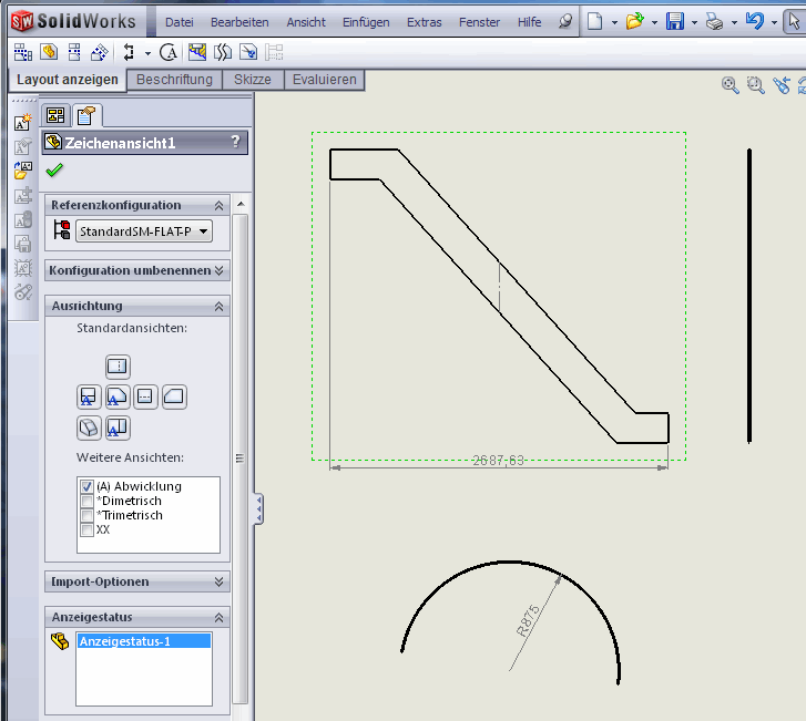 Hallo caipi,da gibt es keinen Fehler, das hast du so modelliert Die Kante, die du beid er Abwicklung "festhälst" ist 7° aus der Horizontalen, ist ja so skizziert. Dadurch liegt die Abwicklung in Bezug auf die Vorderansicht im Modell logischerweise unter 7° zur Hauptebene. Das macht aber im prinzip nichts aus, wenn du in der Zeichnung eine "Abwicklung" als Ansicht generierst wird die automatisch normal auf die Abwicklungsfläche erstellt und liegt eben platt und nicht unter diesen 7°.Die Draufsicht ist aber ...