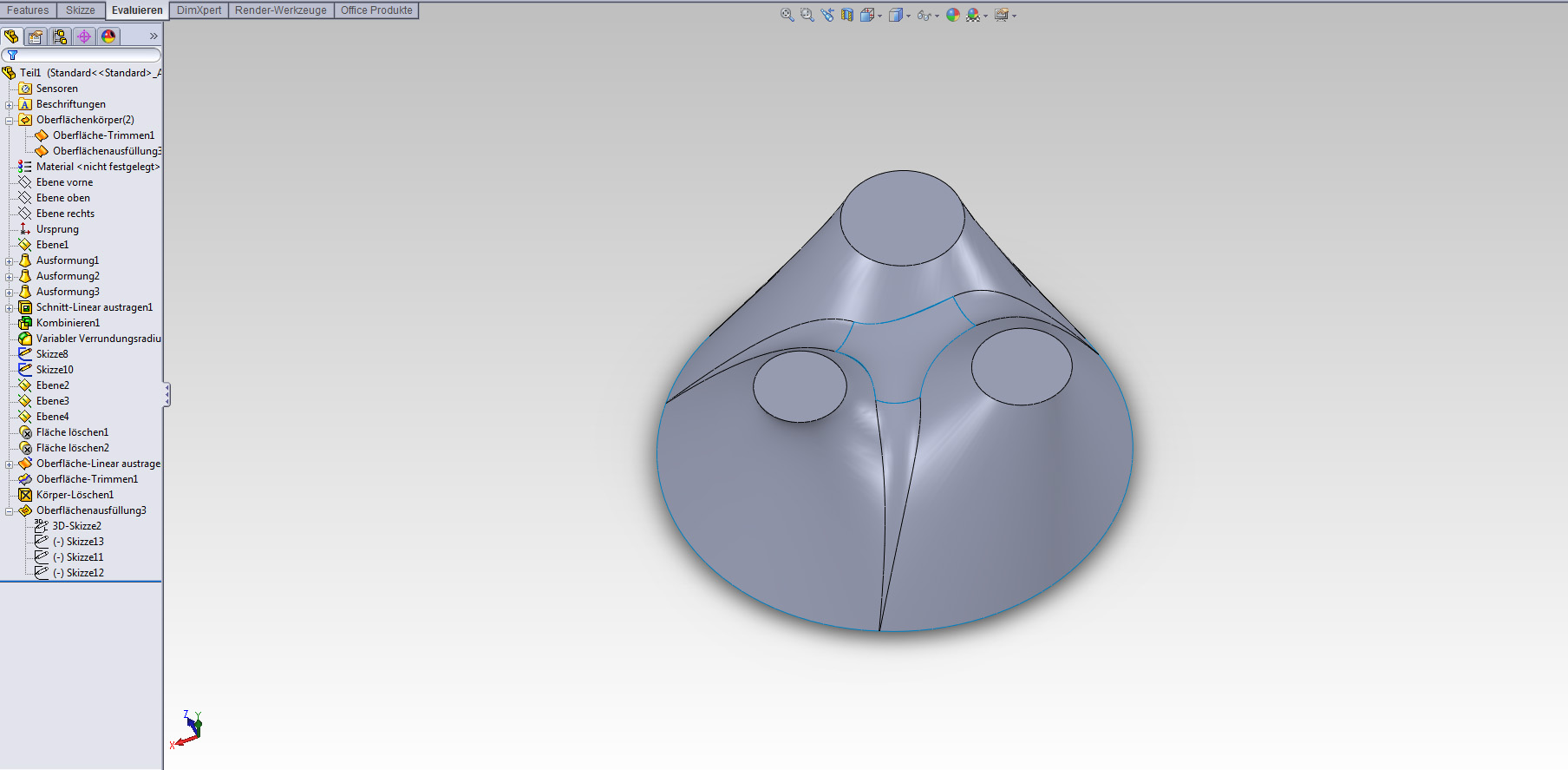 Hey,habs das ganze grad nochmal auf die schnelle zur "Darstellung" in Solid mit Kurven und Flächen aufgezogen.Würd vermutlich so auch richtig funktionieren (tangentiale Übergänge etc.), is aber ne heiden Arbeit bis das ganze wirklich sauber ist.Deshalb auch die Frage ob sowas ohne 200 Kurven und Oberflächenausformungen möglich ist Vereinfacht gesagt, will ich einen Körper, der von 1 großen Kreis, auf x kleine Kreise fließt, dabei jedoch keine Sichtbaren Kanten entstehen, sondern alle Flächen tangential auf ...