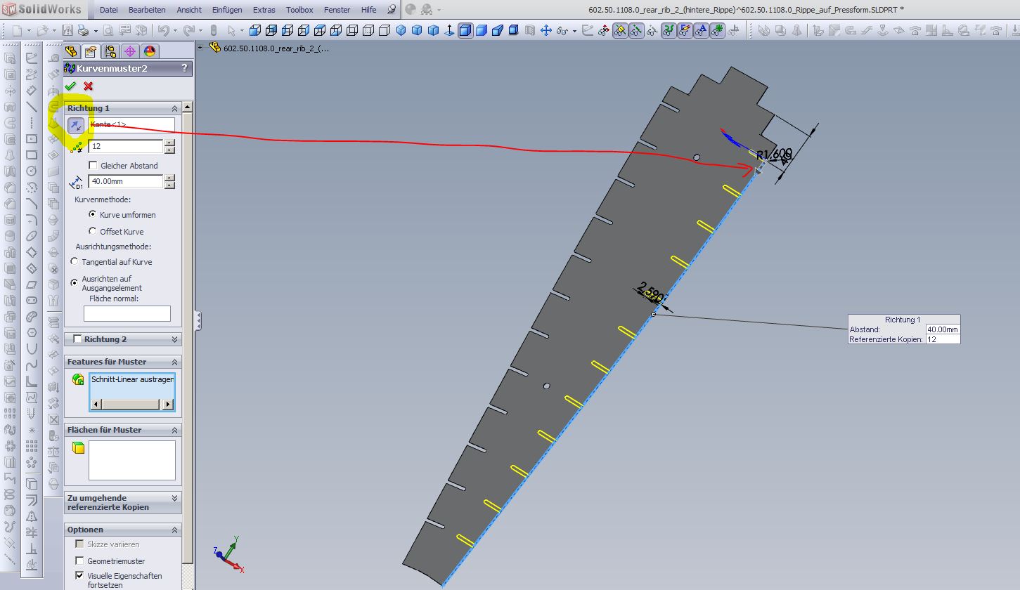 Hallo Stephan,Beim Kurvenmuster musst Du vermutlich die Richtung ändern, bei mir klappt das dann Zu Deiner Lasche , da geht mit Volumenkörper übernehmen nichtsdazu brauchst Du direkt Blech und der Teil der Skizze der komplett eine Lasche geben soll muss ein Spline sein.(Oder mit Spline anpassen zu einem gemacht werden)Nebenbei ist auch auf die Lage der Lasche zu achten , die Biegung muss außerhalb liegen (siehe Bilder)Grüße Andreas ------------------Stillstand ist Rückschritt[Diese Nachricht wurde von K ...