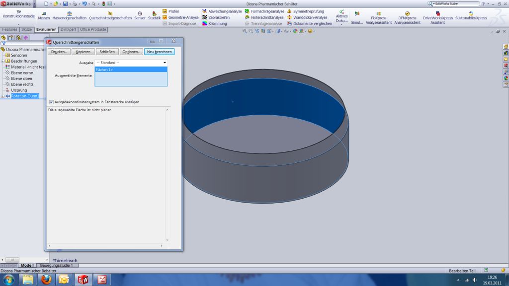 Hallo.Naja ich habe einen Behälter (siehe Foto) und da will ich den Innenring berechnen und wenn ich das Messtool nehme sagt SW mir, dass die Fläche nicht planar ist??Schau mal am Foto, die blaue Fläche würde ich gerne berechnen....wie mach ich das bzw. kann ich mehrere Flächen zusammen messen?Ich mache das mit dem "Querschnittseigenschaften" Toollg[Diese Nachricht wurde von myname80 am 19. Mrz. 2011 editiert.]