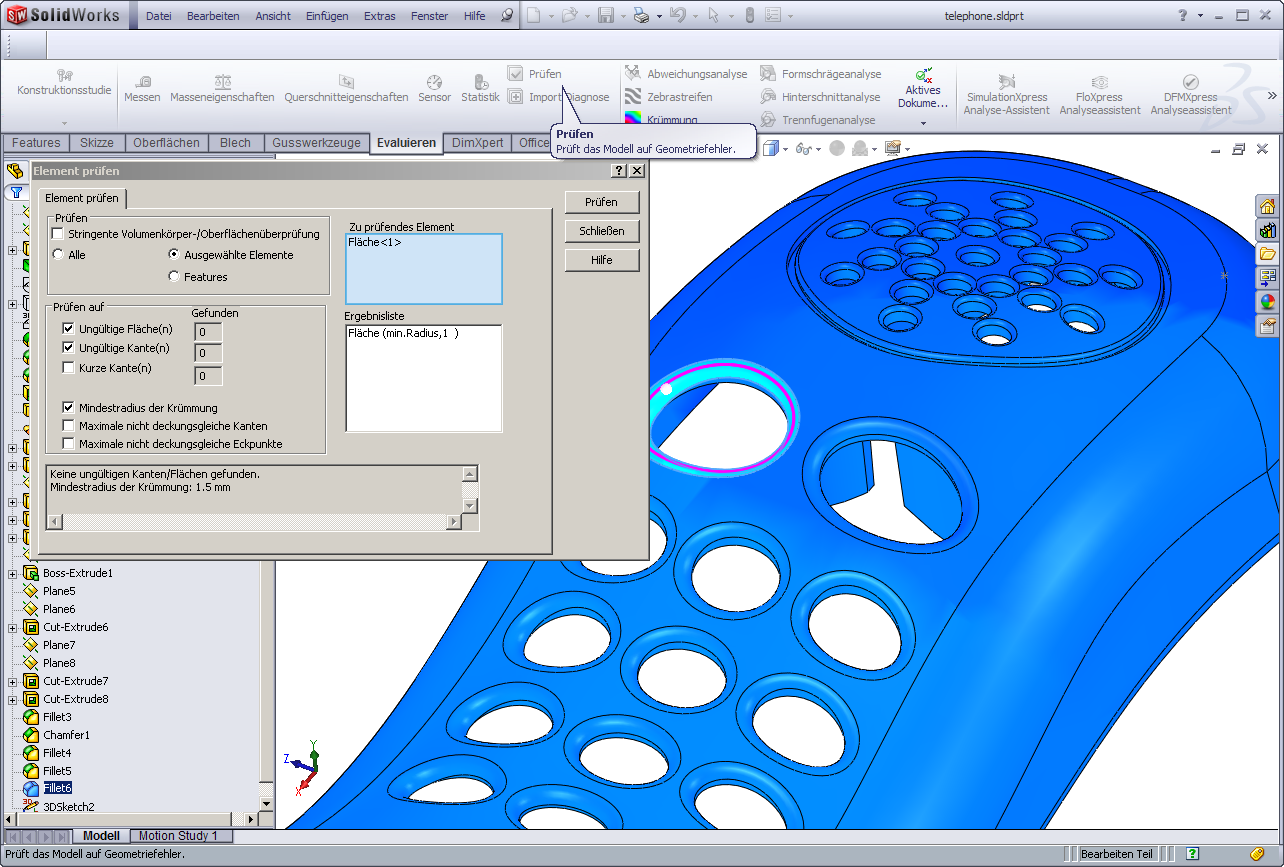 Guten Morgen!Man kann Radien auch noch anders messen, insbesondere, wenn keine Kante vorhanden ist:Evaluieren / Prüfen -- "ausgewählte Elemente" -- Hier die interessanten Elemente / Flächen auswählen / "Mindesradius der Krümmung" und dann -- "Prüfen"Klar gibt es eine Wandstärkenanalyse! Und zwar in den Utilities (Das ist eine Zusatzanwendung, die man einschalten muss, allerdings erst ab SWX Professional)Für mehr Info guckst Du Hilfe ------------------Viele GrüßeUwe MahnerCSWPCSWSTCSWICSWE[Diese Nac ...