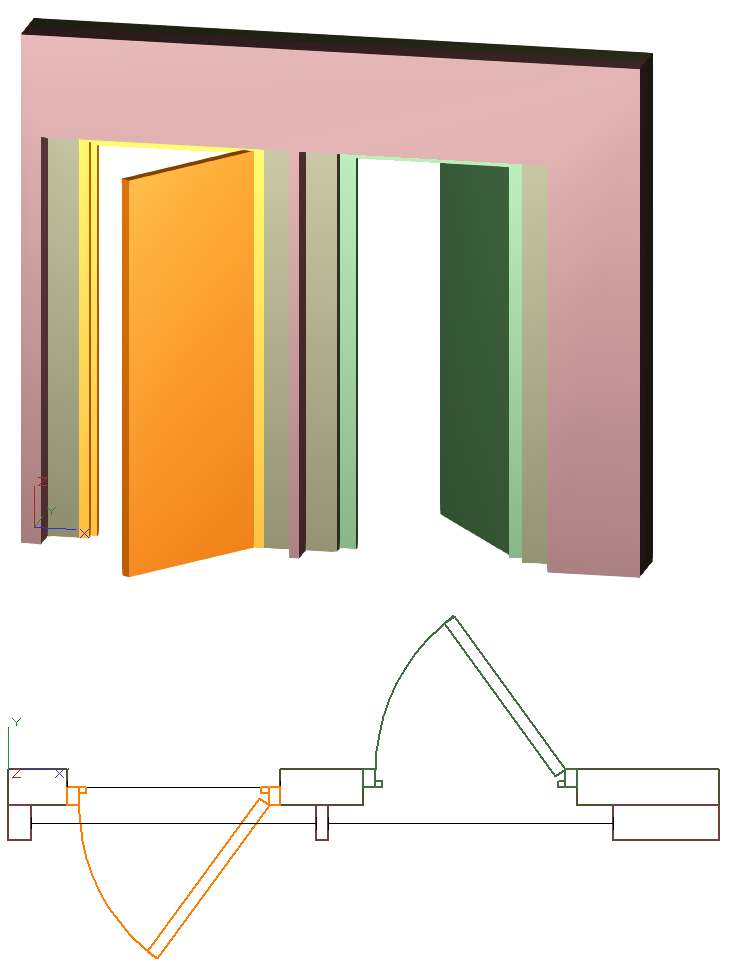 Hallo,meine Vorgehensweise war:- Die beiden Wände erstellen- In die vorderen Wand den breiten Durchbruch erstellen- In der hinteren Wand den schmalen Durchbruch erstellen- Dann die linke Türe einsetzen, unter Eigenschaften,Tür-Allgemein, Türfalz Wert:-37,5mm (negativ)- Die zweite Türe einsetzen und vor dem platzieren in der Kontrolleiste die Schalter der "rechts-links umkehren" und "Innen-Außen umkehren" benutzen. die Türe nun platzieren.- Die Türe auswählen und in den Eigenschaften ,Tür-Allgemein, Türfalz ...