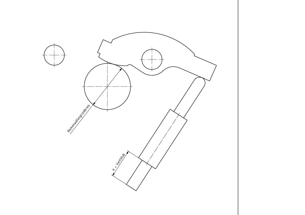 Hallo zusammen...Die einfachste Rechnung wäre, das Übersetzungsverhältnis des Kipphebels zu bestimmen. Dieser lägeüberschlägig bei 1,458.Zur NockenformAus dem Übersetzungsverhältnis und dem Ventilhub lässt sich die Nockenform nicht ableiten!Lediglich der max. Nockenhub kann ermittelt werden. Die Form der Bahn ist frei bestimmbar und wird üblicherweise den gewünschten Betriebsparametern des Motors angepasst. Die Form des Nockens hat einen wesentlichen Einfluss auf das Füllungsverhaltens und der Beschleunigu ...