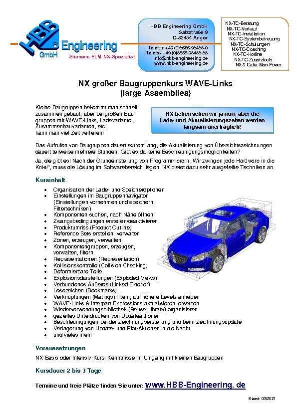 Hallo Alex,das Problem bekommen fast alle Firmen, die länger ( 10 Jahre) mit NX arbeiten. Es gibt eine ganze Reihe von Ursachen, die das Arbeiten mit großen Baugruppen bremsen können und NX bietet eine große Zahl von Softwaremöglichkeiten wieder schneller zu werden.Wir haben daraus sogar einen Kurs gemacht (siehe Anlage). Keine Angst, ich will dir den nicht verkaufen, aber du findest in der Beschreibung Stichpunkte, die dir weiter helfen können.Grundsätzlich ist eine Überprüfung der Situation sehr zu empfe ...