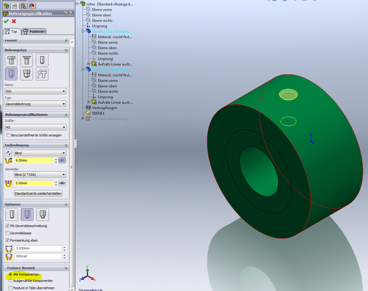 Zitat:Es ist kein Mehrkörperteil. Die Baugruppe besteht aus zwei Teilen.Das Prinzip ist aber das selbe, du mußt wählen auf welche Komponenten das Feature angewendet werden soll, siehe Bild.Aber dein Problem ist wohl die fehlende Senkung da er nur Kanten in Kreisform für die Gewindedarstellung erkennt und keine 3D-Spline.Falls du keine Senkung gebrauchen kannst, kannst du auch im nachhinein über Einfügen - Beschriftungen - Gewindedarstellung diese einfügen. Falls das beides nicht geht, stell mal bitte eine ...